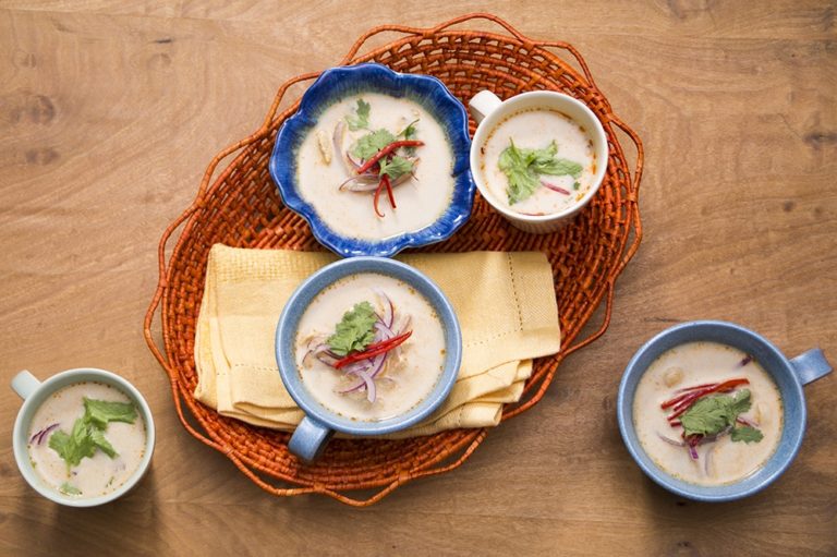 Inspirada na Tom Kha Gai, receita tradicional tailandesa, esta sopa é exótica, perfumada, um sucesso na mesa. Prepare o caldo com cascas e cabeças de camarão, é reaproveitamento de luxo!