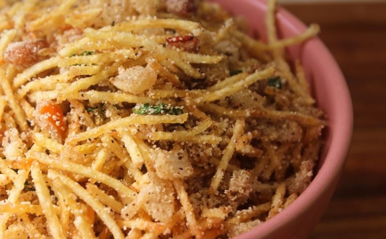 Continue lendoIngredientes: 2 xícaras de chá de batata palha; 2 xícaras de chá de farinha de mandioca; 200 gramas de bacon cortado em cubos; 1 unidade de cebola média