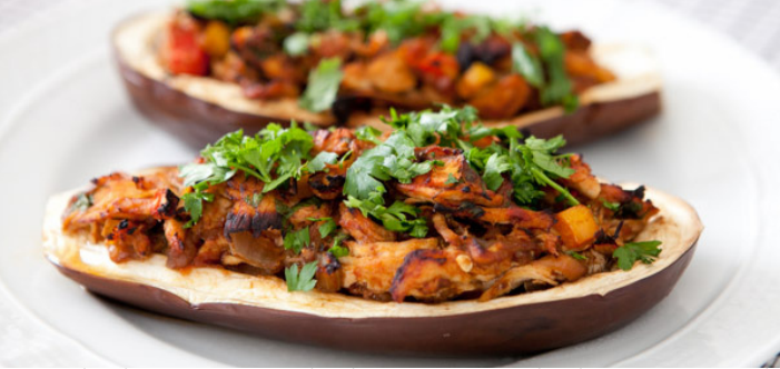 Continue lendoINGREDIENTES 1 berinjela grande; 150g de peito de frango; 1 tomate picado; 1/3 de pimentão amarelo picado; 1 cebola pequena