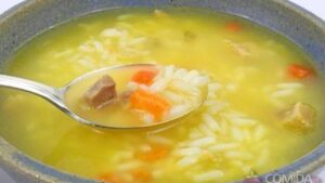 para o caldo, acrescentando o arroz, os cubos de cenoura e os de batata. Deixe