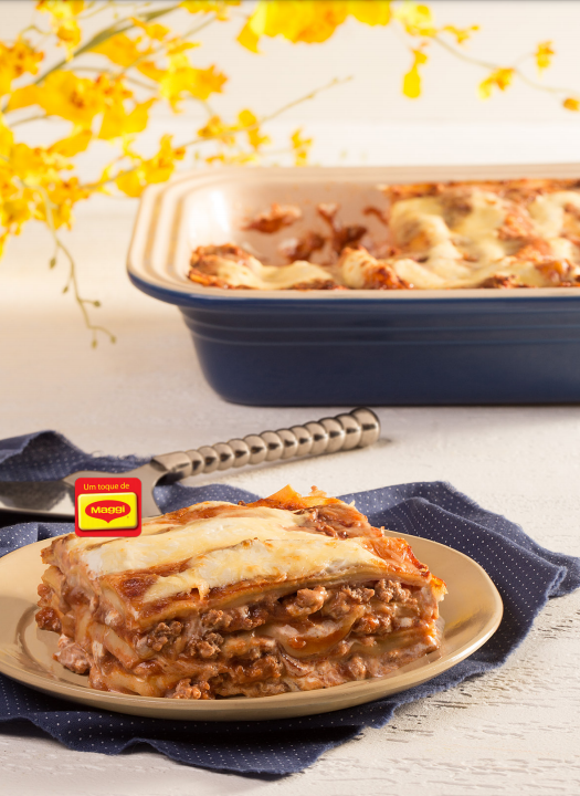 4. Vá intercalando uma camada de massa, uma de molho, uma fatia de queijo prato,
