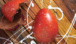 Preencha duas formas para ovo de páscoa de 500g com o chocolate temperado, vire