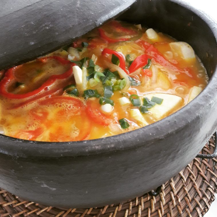 - Em uma panela grande (de preferência de cerâmica) em fogo baixo, coloque o óleo e refogue o alho e a cebola até ficarem levemente dourados.